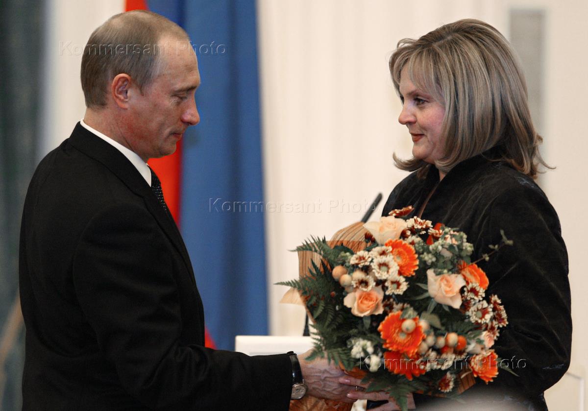 Президент России Владимир Путин (слева) вручает председателю Комиссии по правам человека при Президенте России Элле Памфиловой (справа) орден "За заслуги перед Отечеством" IV степени на церемонии награждения государственными наградами России ученых, политиков и государственных деятелей. Церемония состоялась в Екатерининском зале Большого Кремлевского дворца.