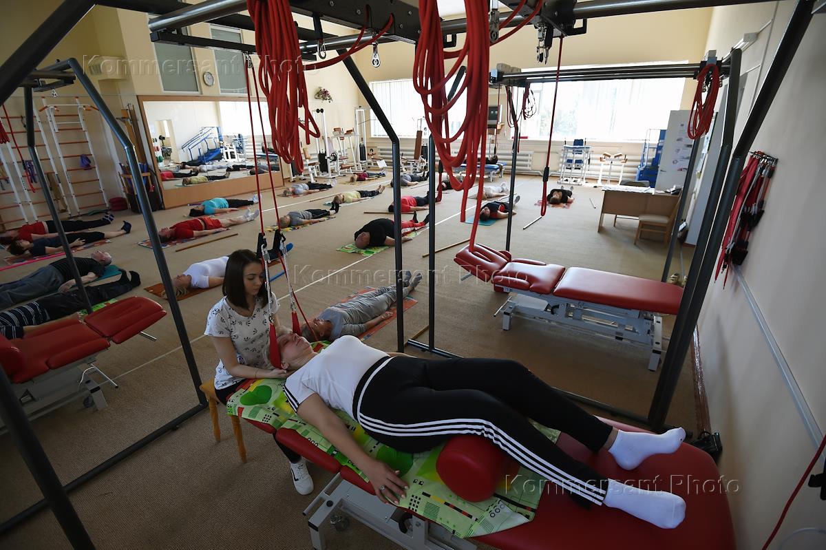 Военный клинический санаторий имени Пирогова Министерства обороны России. Пациенты санатории во время курса реабилитации в тренажерном зале санатория.