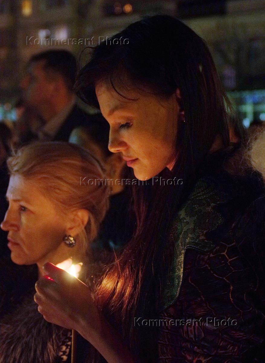 Акция памяти жертв трагических событий в Санкт-Петербурге прошла в Симферополе. Участники акции во время возжигания свечей у памятного стенда, посвященного трагическому событию.