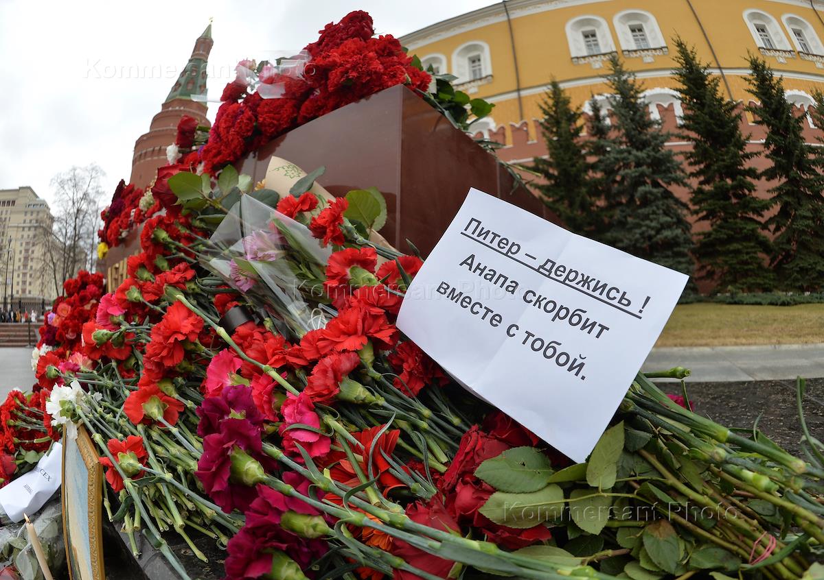 Цветы, принесенные москвичами, у мемориала города-героя Ленинграда в Александровском саду в память о погибших при теракте в метро Санкт-Петербурга.