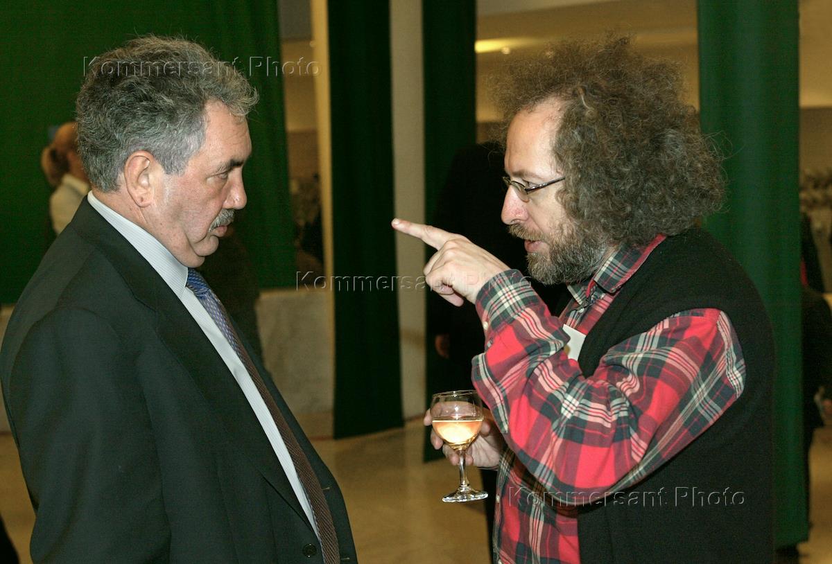 Chief editor of the "Echo of Moscow" radiostation Alexei Venediktov (right) and president of the National Association of Broadcasters Eduard Sagalaev (left) attended the concert devoted to the 10th anniversary of the NTV channel that was held in the Moscow International Music House.
