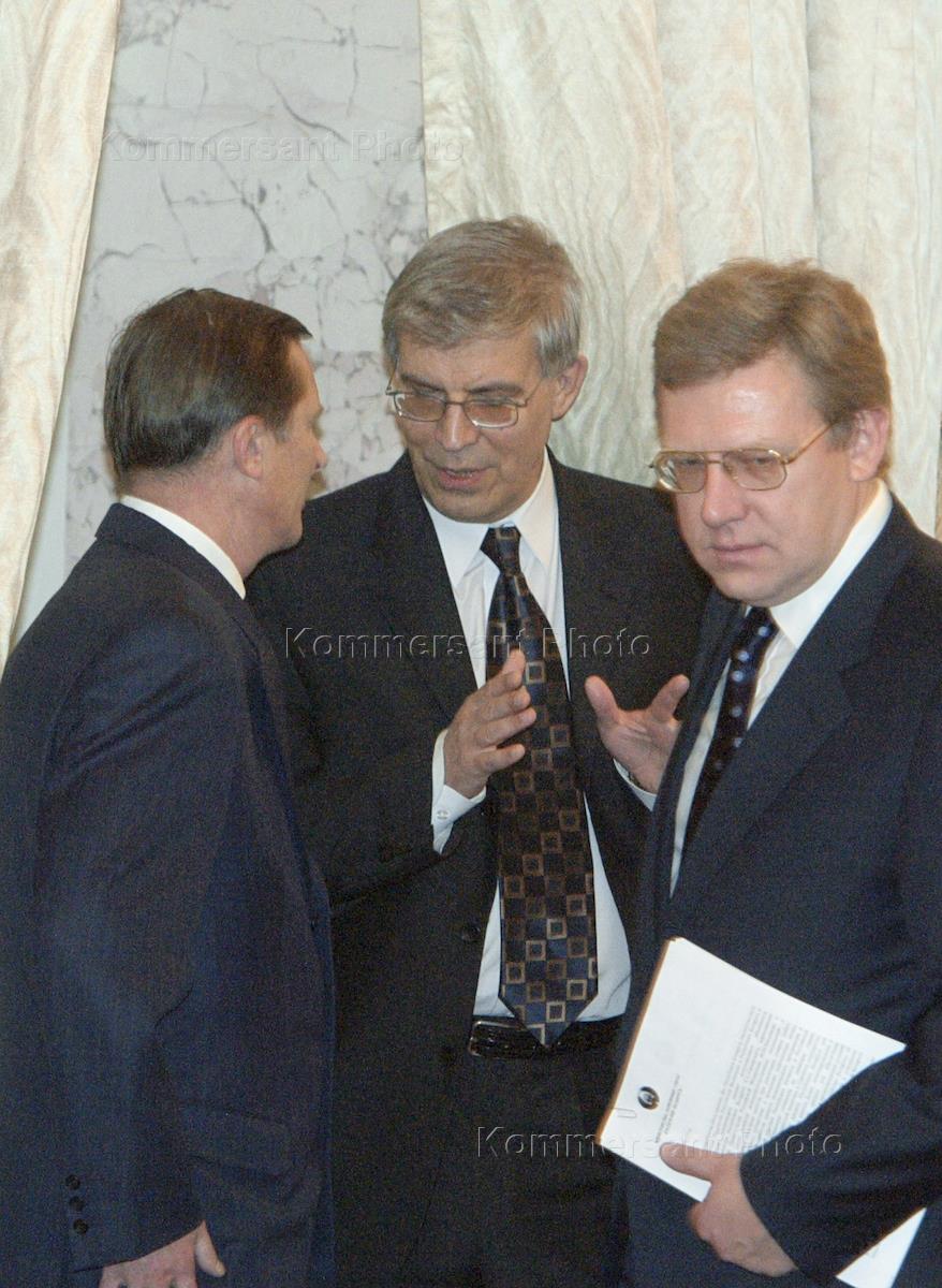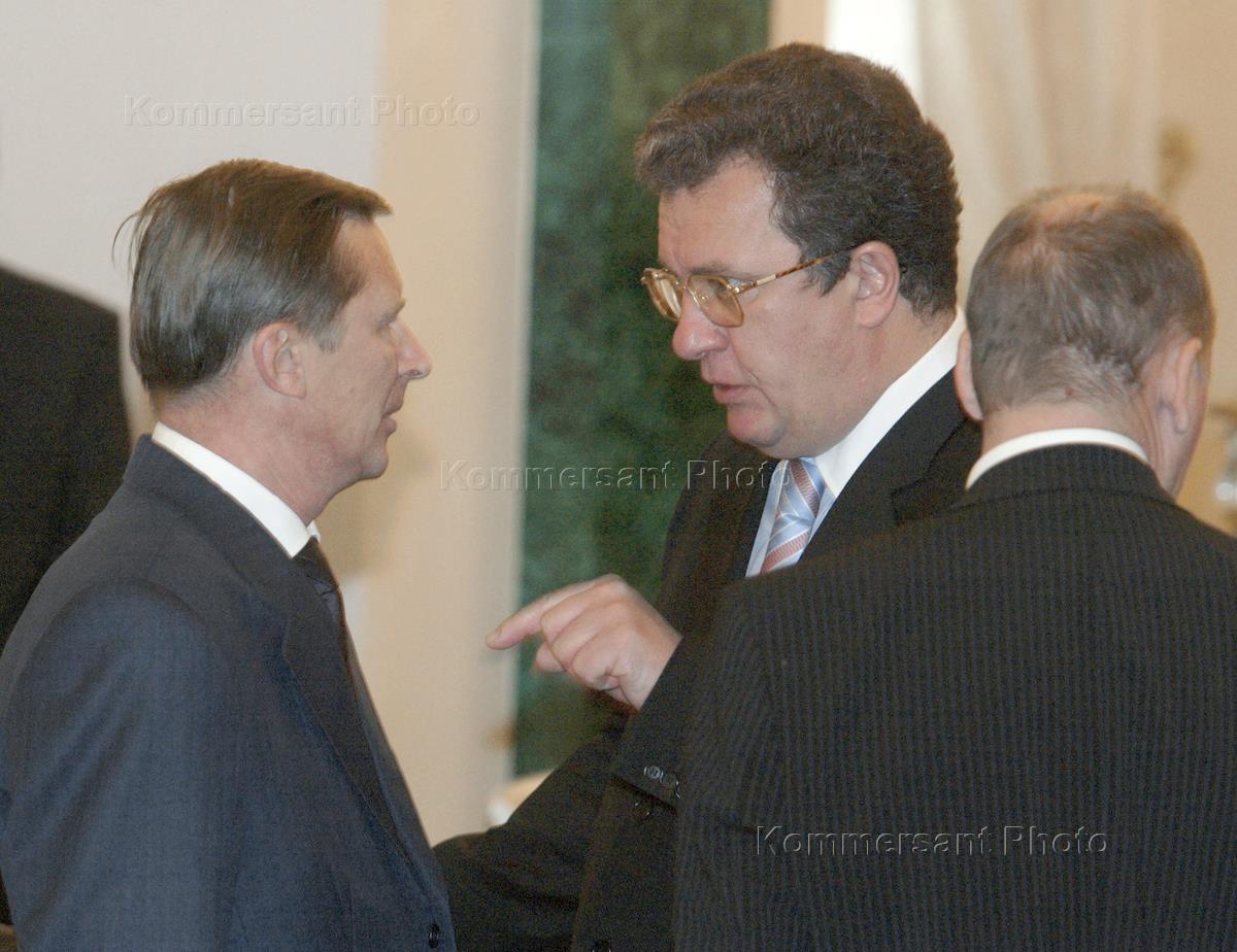 Министр обороны России Сергей Иванов (слева), председатель Центрального Банка России Сергей Игнатьев (в центре) и заместитель председателя Правительства России, министр финансов Алексей Кудрин (справа) на заседании Высшего Государственного совета Союзного государства России и Белоруссии. Заседание прошло в Кремле.