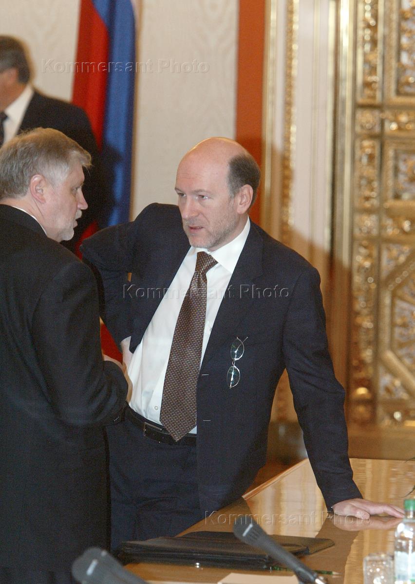 Министр обороны России Сергей Иванов (слева) и председатель Центрального Банка России Сергей Игнатьев (справа) на заседании Высшего Государственного совета Союзного государства России и Белоруссии. Заседание прошло в Кремле.