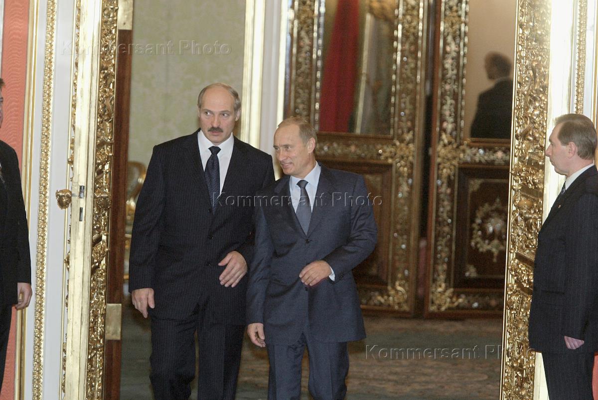 Президент России Владимир Путин (справа), президент Белоруссии Александр Лукашенко (второй справа) и председатель Правительства России Михаил Касьянов (слева) на заседании Высшего Государственного совета Союзного государства России и Белоруссии. Заседание прошло в Кремле.