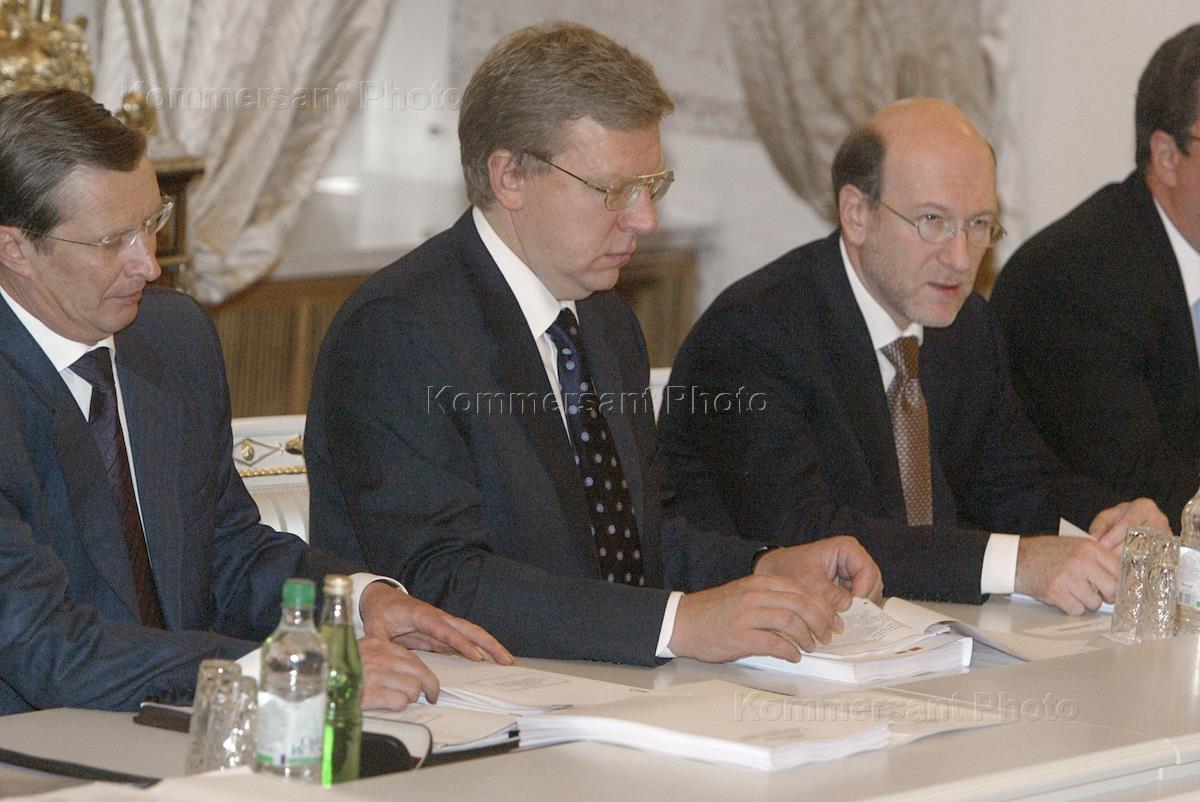 Министр обороны России Сергей Иванов (слева), председатель Центрального Банка России Сергей Игнатьев (в центре) и заместитель председателя Правительства России, министр финансов Алексей Кудрин (справа) на заседании Высшего Государственного совета Союзного государства России и Белоруссии. Заседание прошло в Кремле.