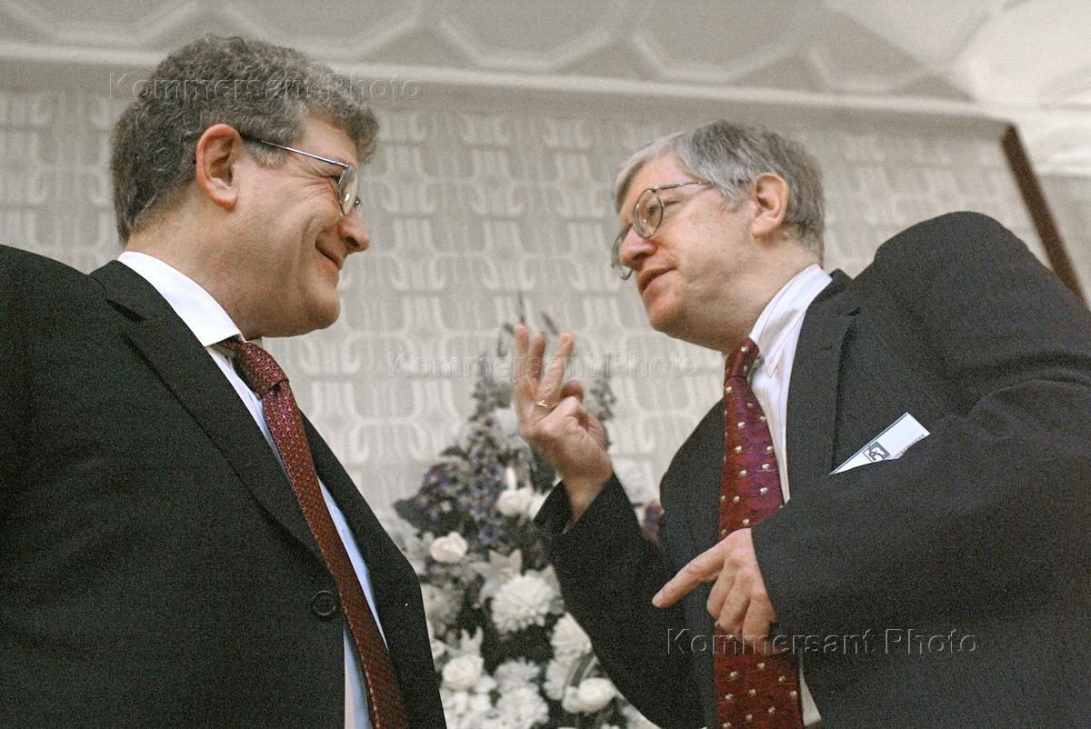 Председатель правления Центра политических технологий Марк Урнов (слева) и президент Ассоциации независимых центров экономического анализа (АНЦЭА) Леонид Григорьев (справа) на первой в России Международной конференции по риск-менеджменту "Риски российской экономики: анализ, оценка, управление". Конференция прошла в "Президент-отеле".