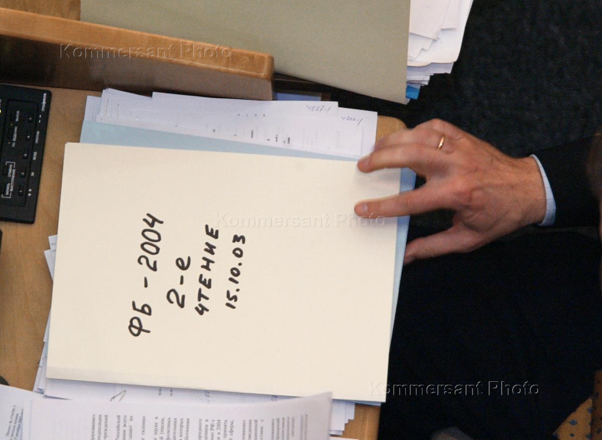 An unidentified lawmaker of the State Duma (lower house of Russian parliament) opens a draft version of the federal budget for the year 2004.