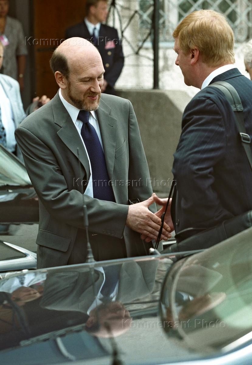 Kremlin chief of staff Alexander Voloshin (left) shakes hands with Anatoly Chubays (right) - the board chairman of the national eletricity producer and distributor Unified Energy Systems of Russia (UES) - after the UES shareholders meeting which was held in the town of Konakovo outside Moscow.
