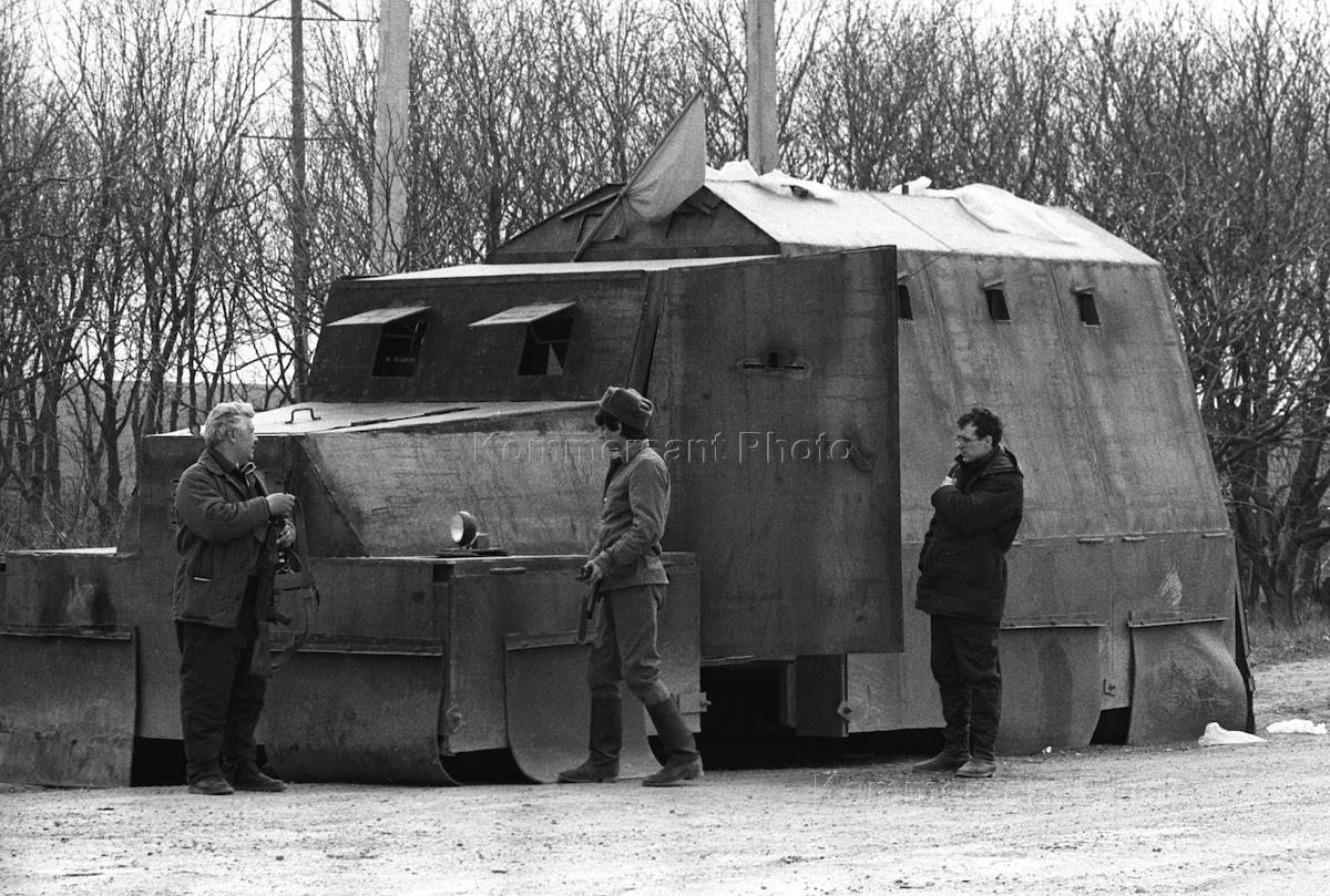 Members of an independence movement of Transdniestria stand near a home made armour vehicle.