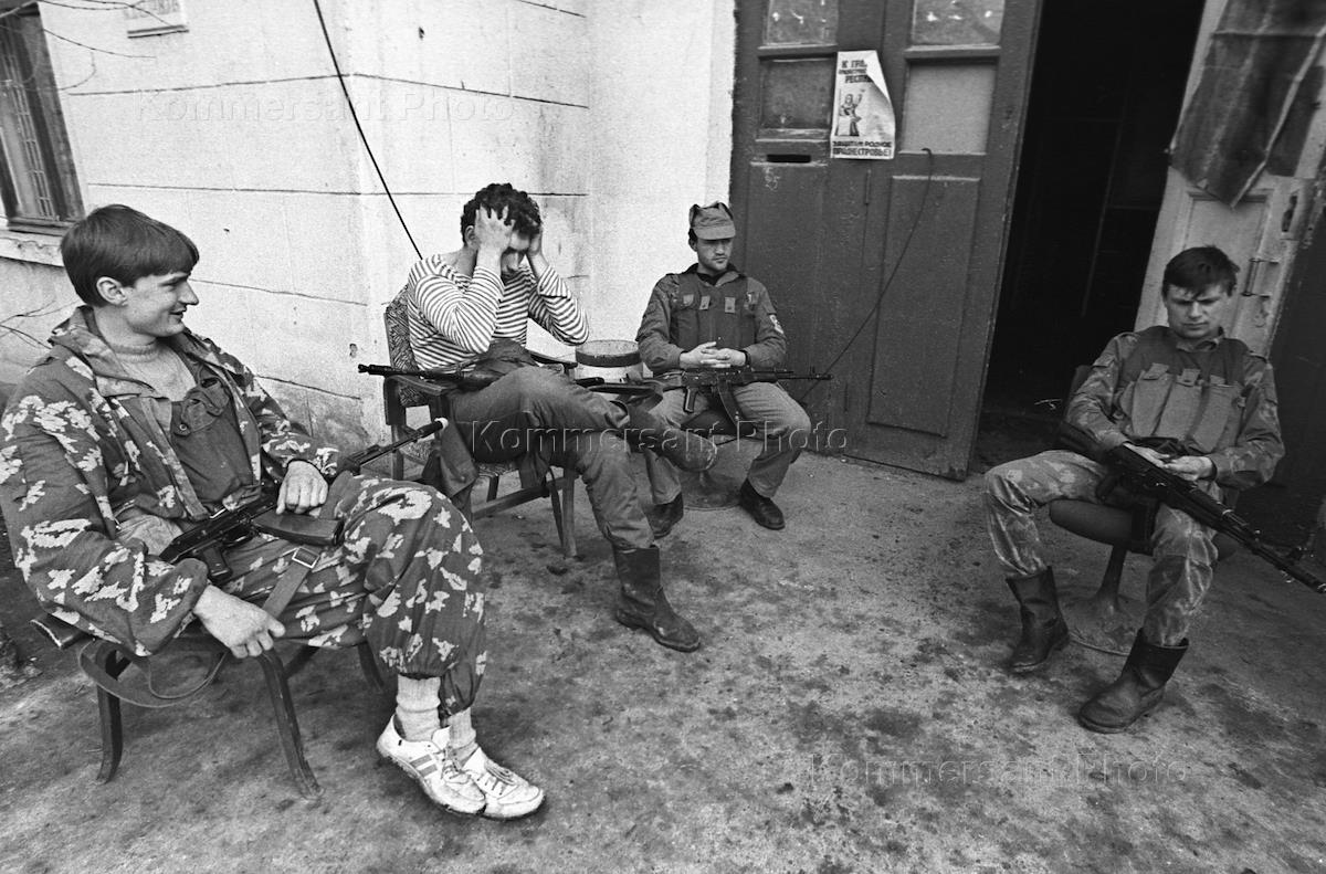 Armed militiamen of the break-away Moldovan republic of Transdniestria read local papers delivered to the Moldovan-Transdniestrian frontline.