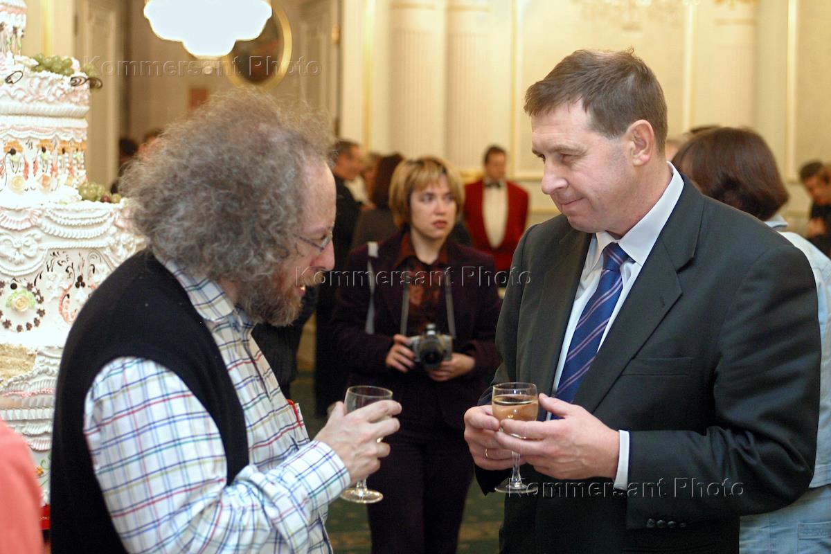 Министр труда и социального развития России Александр Починок (слева) и главный редактор радиостанции "Эхо Москвы" Алексей Венедиктов (справа) на праздновании 13 - летия радиостанции "Эхо Москвы" в ресторане "Прага".