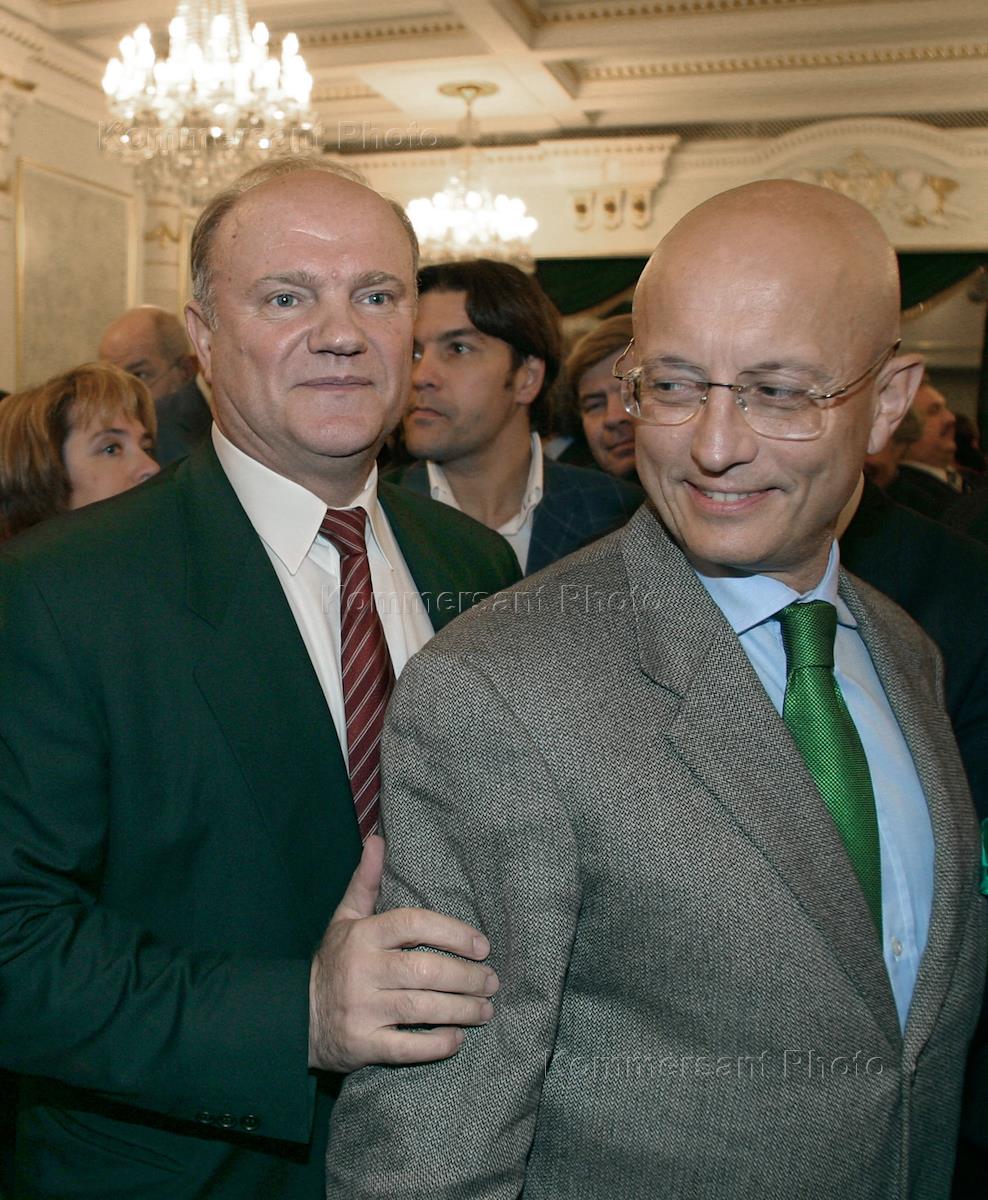 Лидер Коммунистической партии России (КПРФ), член Совета Государственной Думы России Геннадий Зюганов (слева) и депутат Государственной Думы России, член фракции КПРФ Василий Шандыбин (справа) на праздновании 13 - летия радиостанции "Эхо Москвы" в ресторане "Прага".