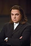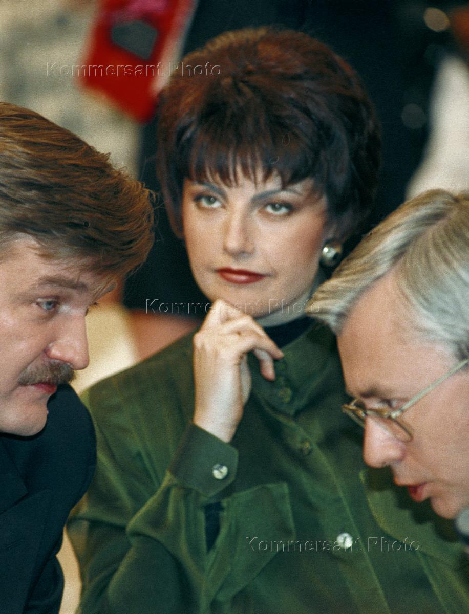 TV-hosts Evgeny Kiselev (left) and Tatiana Mitkova (centre) participate in the "Tema" TV-programm on ORT channel.