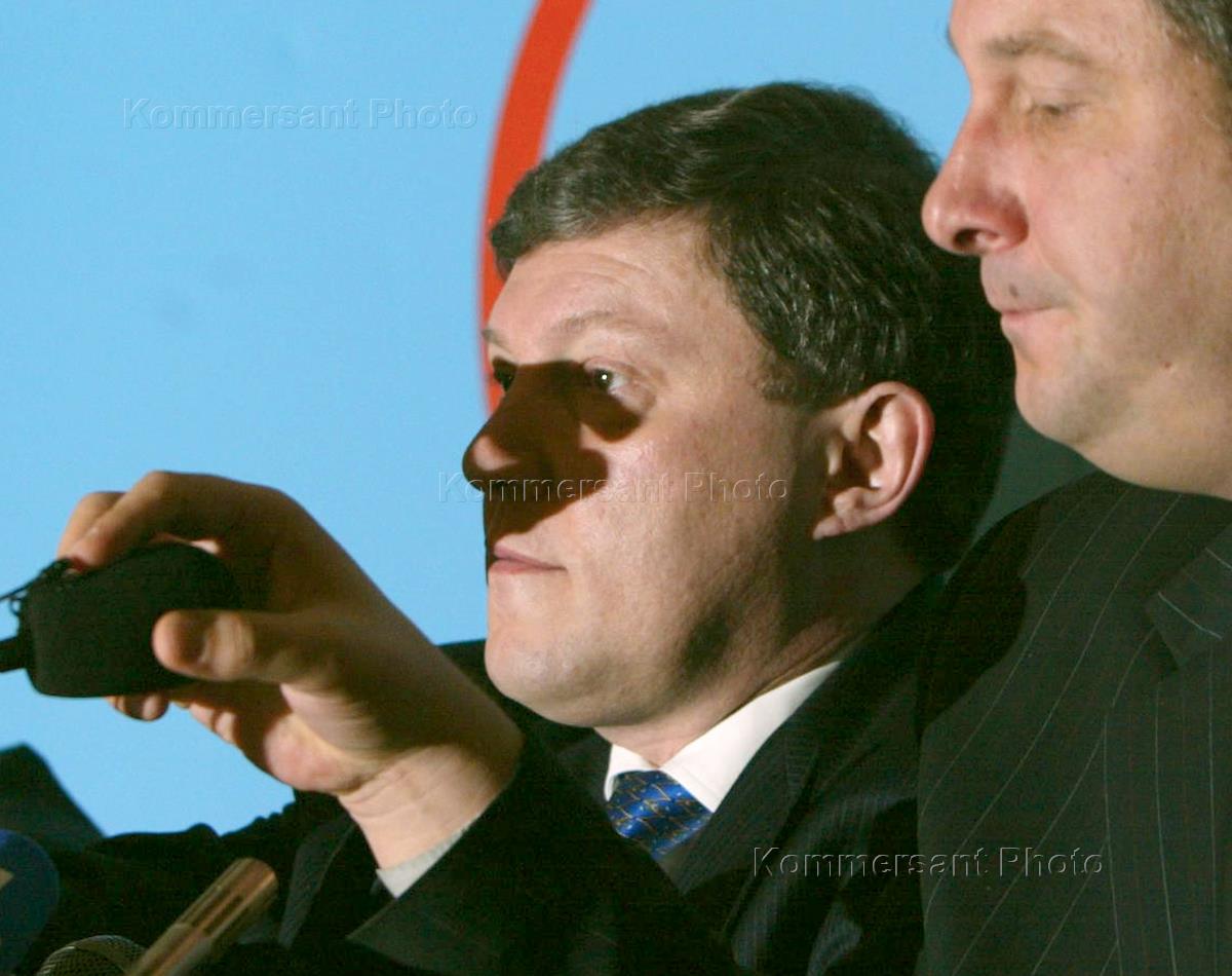 Leader of the "Yabloko" faction in the State Duma Grigory Yavlinsky (right) and the first deputy chairman of the "Yabloko" faction in the State Duma Sergei Ivanenko (left) took part in the opening ceremony of the "YABLOKO-10 years" exhibition. The exhibition was held in the Modern History Museum.