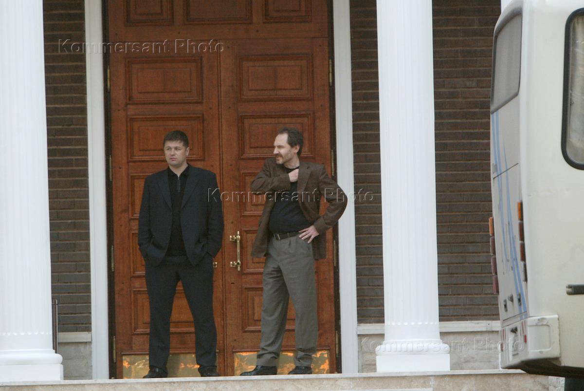 Заместитель председателя правления НК ЮКОС Василий Шахновский (справа) у дверей офиса компании в Жуковке, во время обыска Генеральной прокуратуры России.