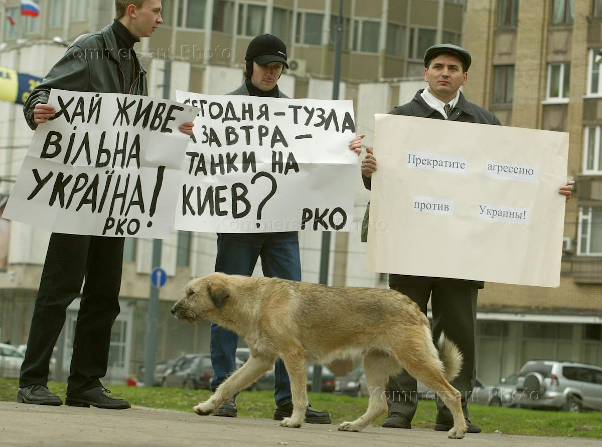 Participants of the revolutionary union took part in the rally against Russia's intentions to capture ukranian island Tuzla in Kerchensky channel. It was held near the Foreign Affairs Ministry.