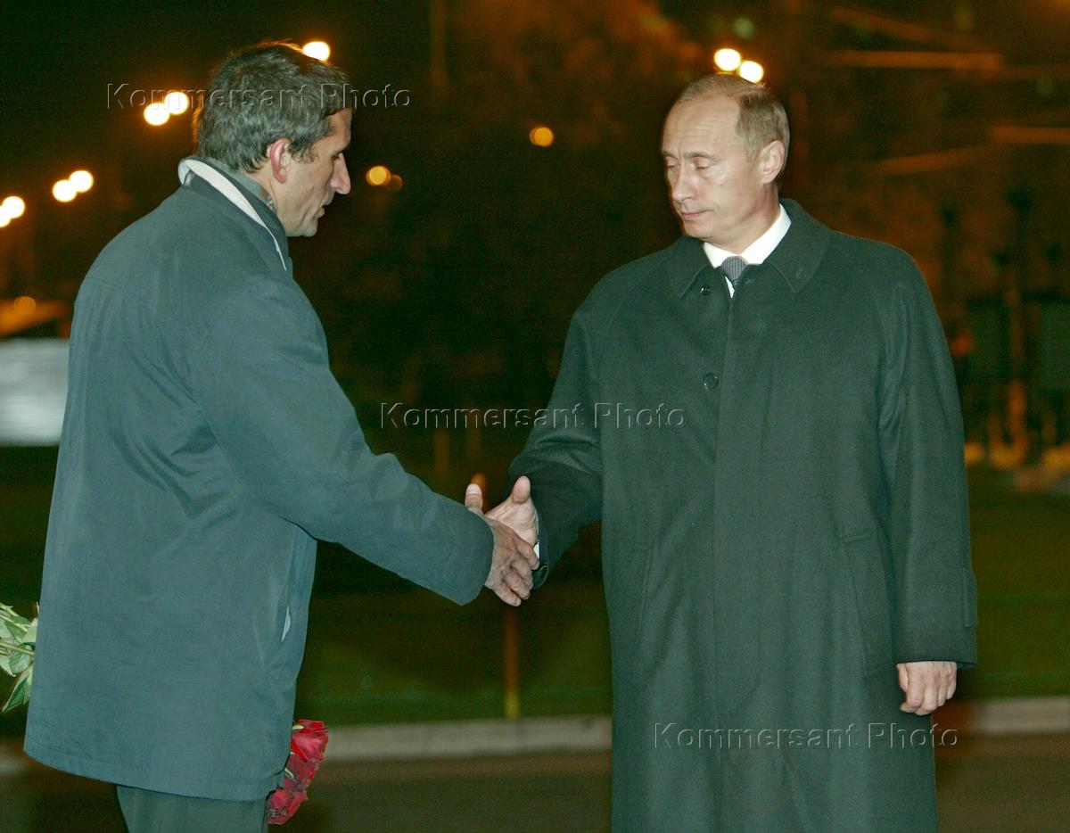Президент России Владимир Путин (справа) и продюсер мюзикла "Норд - Ост" Георгий Васильев (слева) на церемонии открытия памятного знака у театрального центра на Дубровке, посвященного жертвам терроризма. Церемония прошла в годовщину захвата террористами зрительного зала театрального центра на Дубровке, в котором шла демонстрация мюзикла "Норд-Ост".