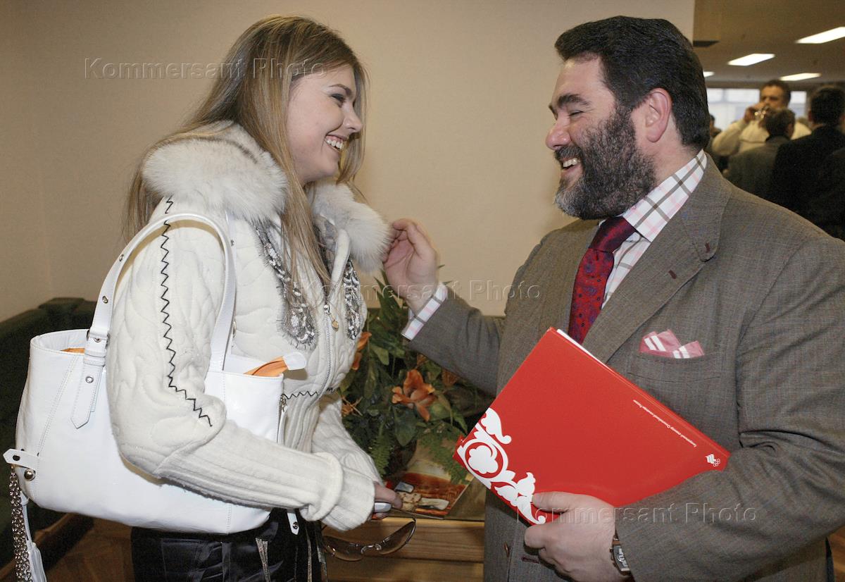 Гимнастка Алина Кабаева (слева) и глава компании "Боско ди Чильеджи" в России Михаил Куснирович (справа) на пресс-конференции, посвященной подписанию Олимпийского комитета России и Bosco di Ciliegi спонсорского соглашения на проведение XXVIII Олимпиады 2004 года в Афинах и XX зимних Олимпийских игр 2006 года в Турине.