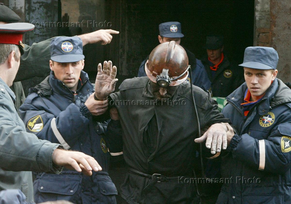 Последствия катастрофы на шахте "Западная-Капитальная" города Новошахтинск. Спасенный шахтер выходит из шахты.