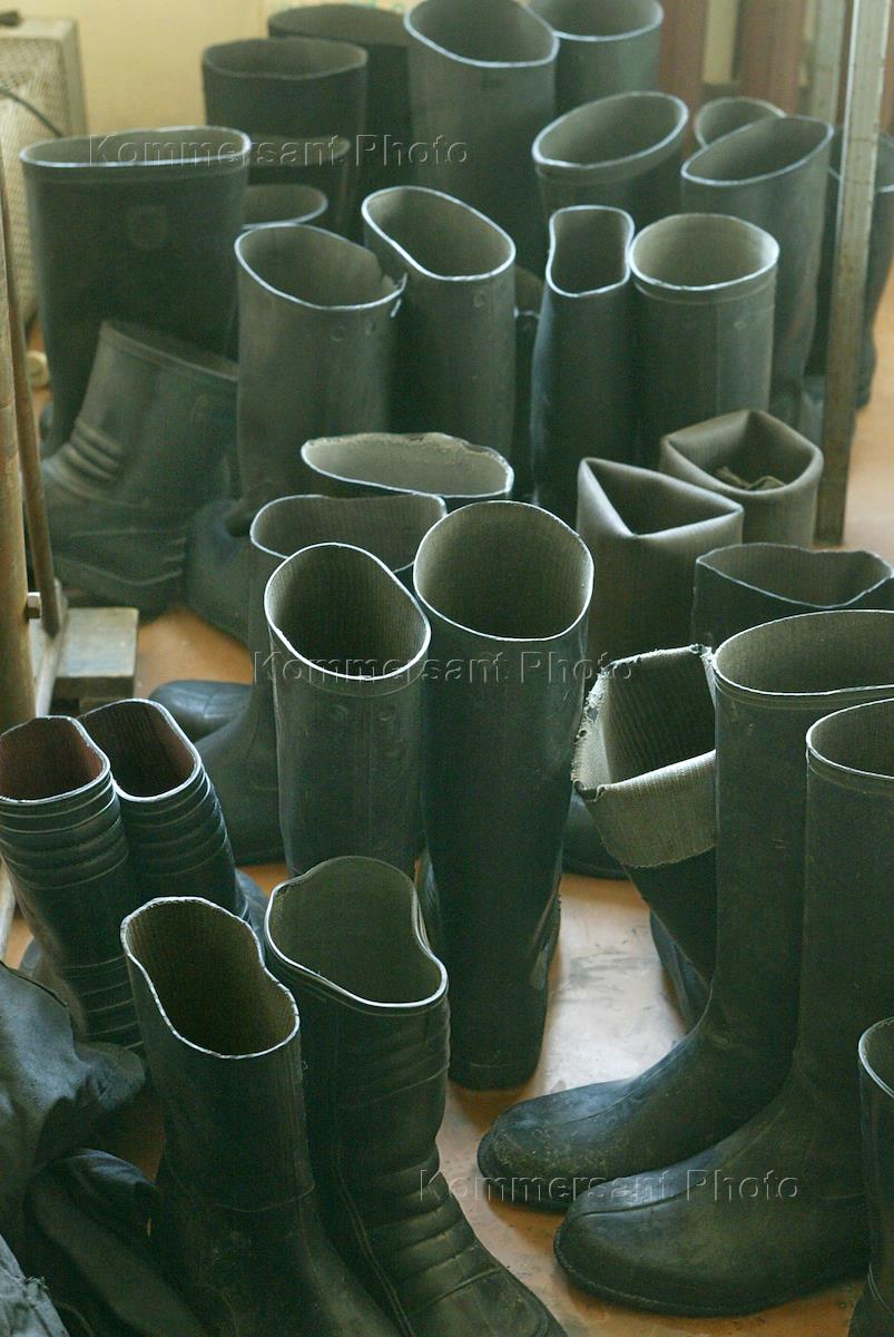 Последствия катастрофы на шахте "Западная-Капитальная" города Новошахтинск. Резиновые сапоги в шахтерской раздевалке.