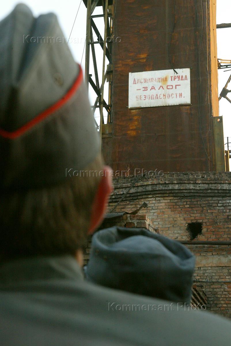 Последствия катастрофы на шахте "Западная-Капитальная" города Новошахтинск. Сотрудники милиции у входа в шахту. Лозунг на стене "Дисциплина труда - залог безопасности".