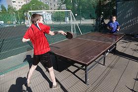 Региональный проект "Дворовый тренер" в Пермском крае. Спортивная площадка. Дети играют в настольный теннис.