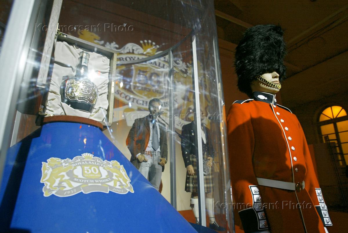 Английский гвардеец в карауле у витрины с бутылкой виски "Рояль Салют". Торжественный прием и презентации виски прошли в помещении Нового Манежа.
