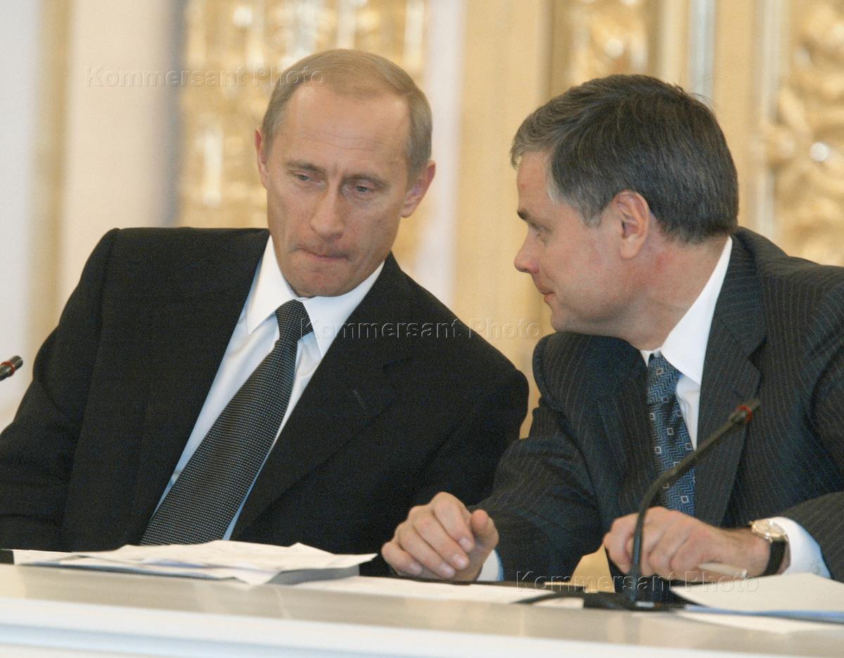 Председатель Правительства России Михаил Касьянов (слева) и Президент России Владимир Путин (справа) во время заседания Государственного совета в Кремлевском дворце.
