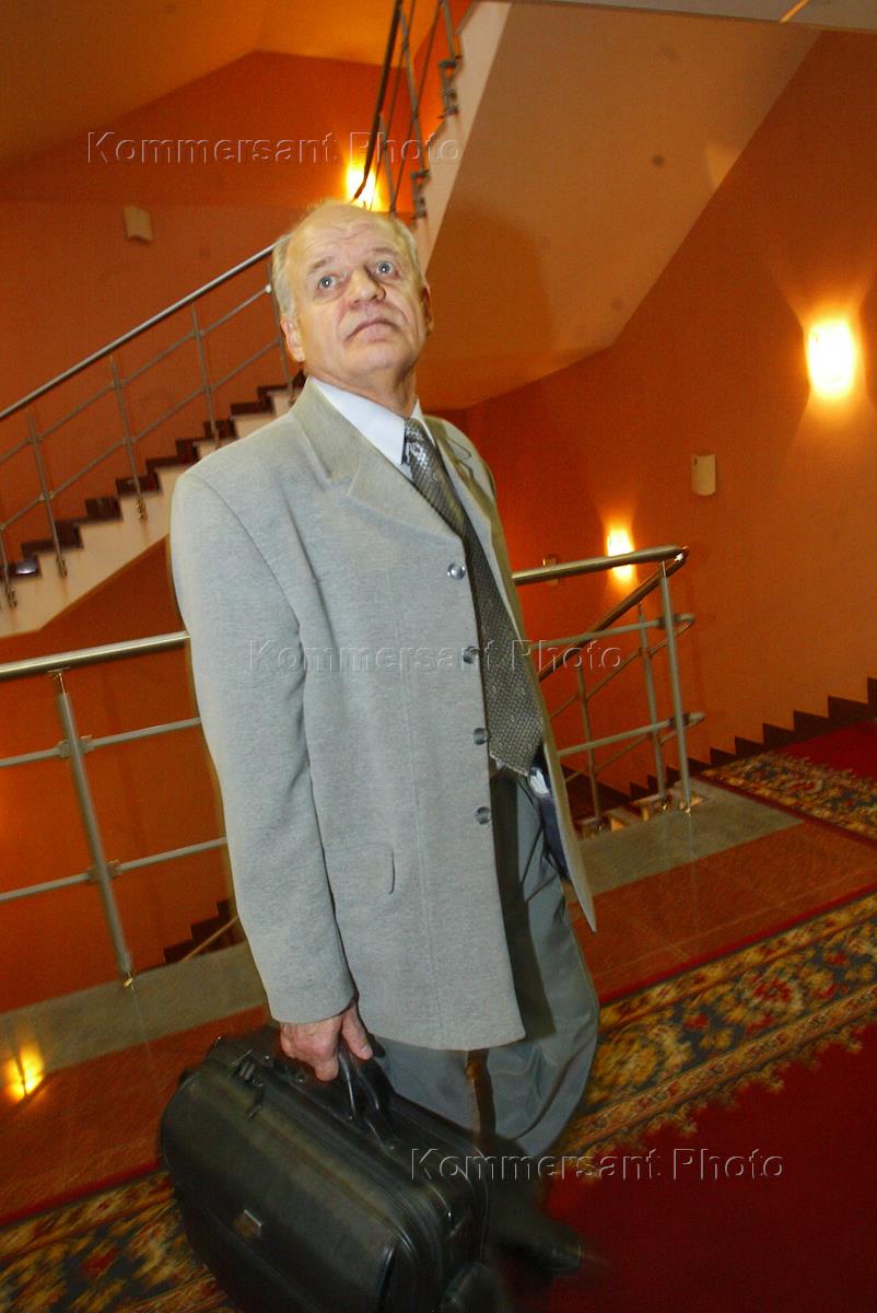 Chairman of the Central Electoral Commission (CIK) Alexander Veshnyakov (right) is interviewed after a CIK meeting, as Victor Cherepkov, a member of the State Duma 'People's Deputy' faction, strolls around the CIK lobby (background left).