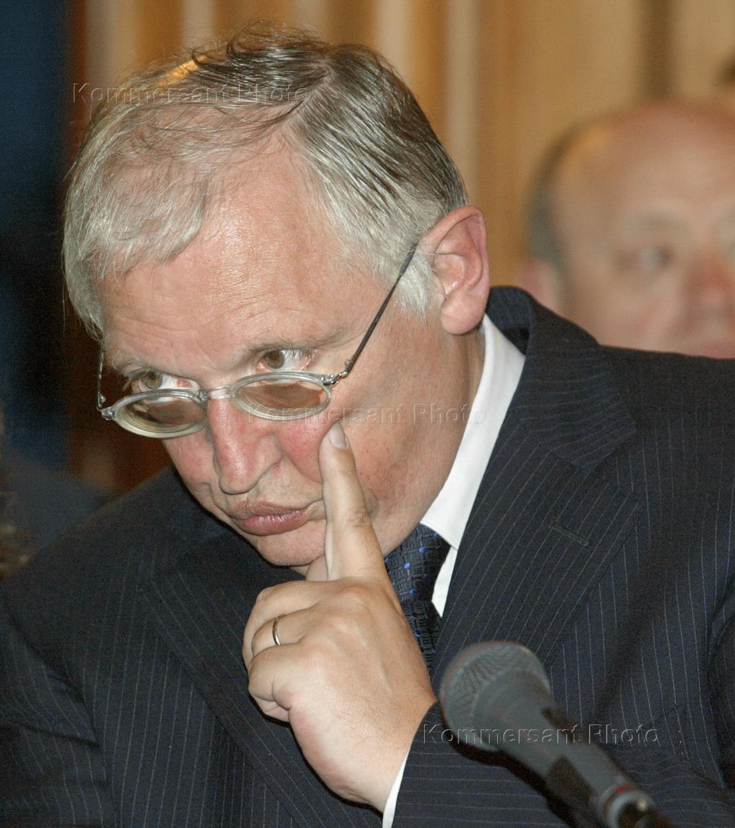 Член Европейской комиссии Гюнтер Ферхойген во время пресс-конференции, посвященной подготовки к саммиту "Россия - ЕС", который пройдет в Риме в ноябре 2003 года. Пресс-конференция состоялась в особняке министерства иностранных дел (МИД) России.