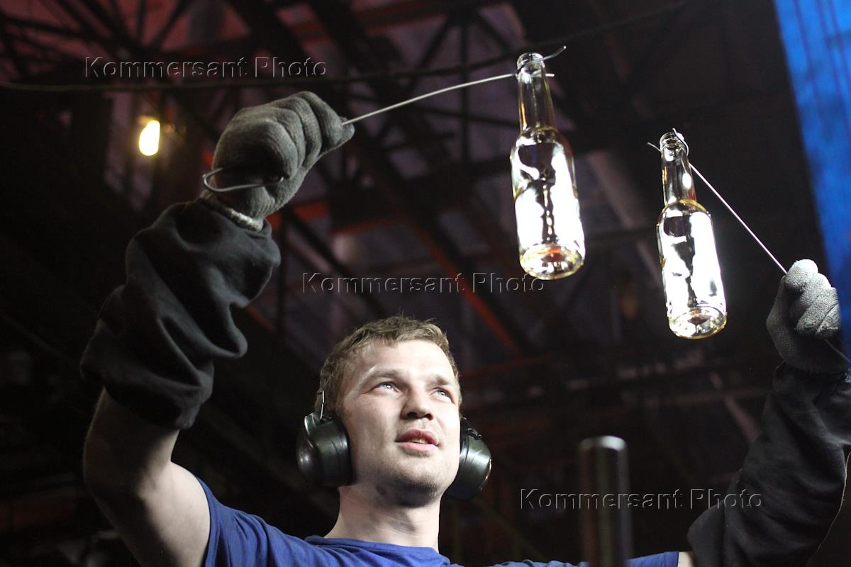 Работник контролирует выход бутылок из печи № 2 на заводе "Экран" в Новосибирске.