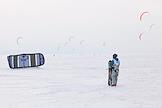 Всероссийские соревнования по сноукайтингу "Марафон Жигулевское море 2015" прошли на акватории Куйбышевского водохранилища. Спортсмен идет со сноубордом в руках.