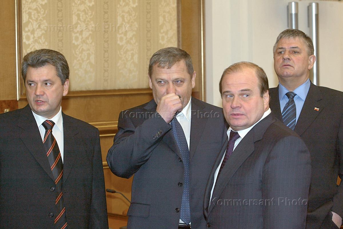Alexander Rumyantsev, Russian Minister of Nuclear Power (left), Russian Communications Minister Mikhail Lesin (centre) and Russian Federal Securities Commission head Igor Kostikov (right) attended the government meeting.