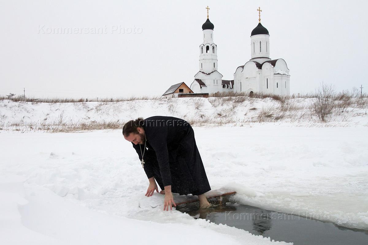 Крещенские купания во время праздника Крещения Господня. Настоятель храма князя Александра Невского отец Артемий окунается в прорубь на реке Мильтюш в селе Бурмистрово.