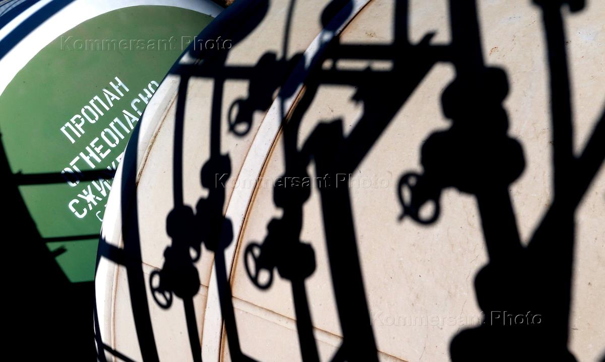 Жанровая фотография. Железнодорожная цистерна со сжиженным газом пропаном на погрузочном терминале химического завода.