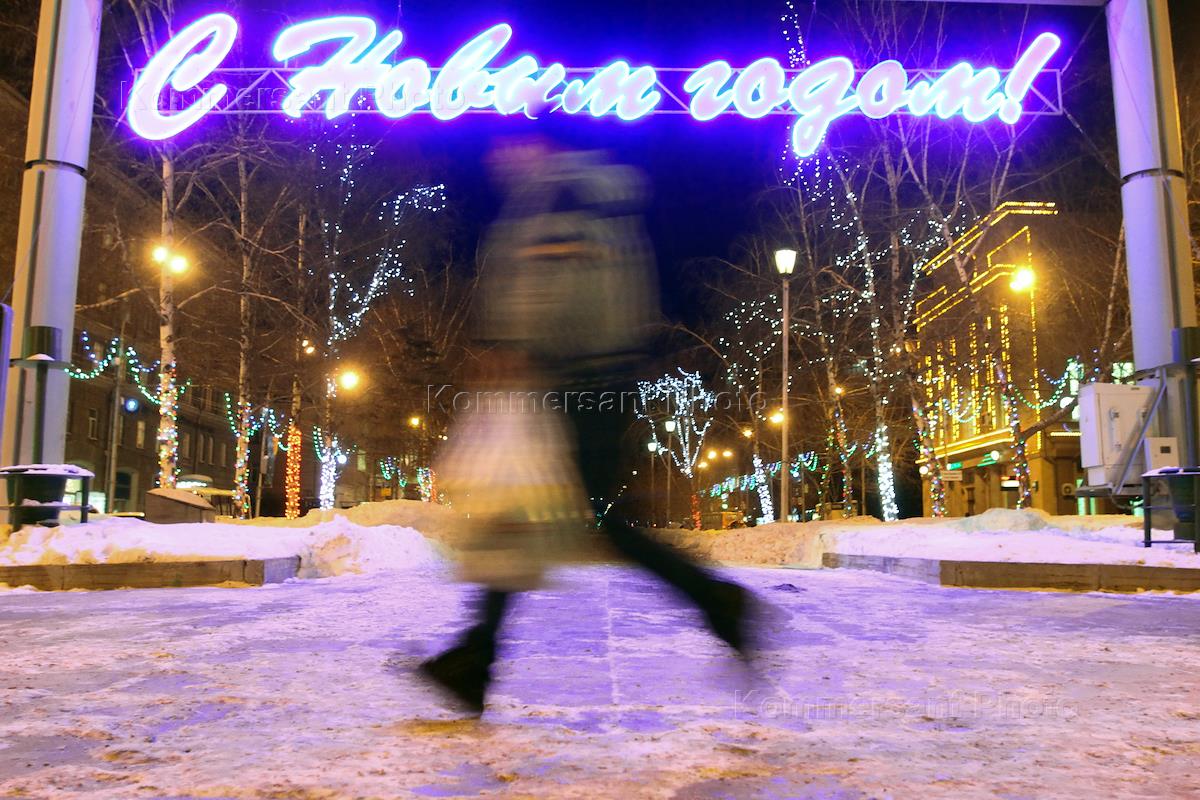 Views of Novosibirsk. People are by New Year's tree in Pimyonov Square in Novosibirsk.