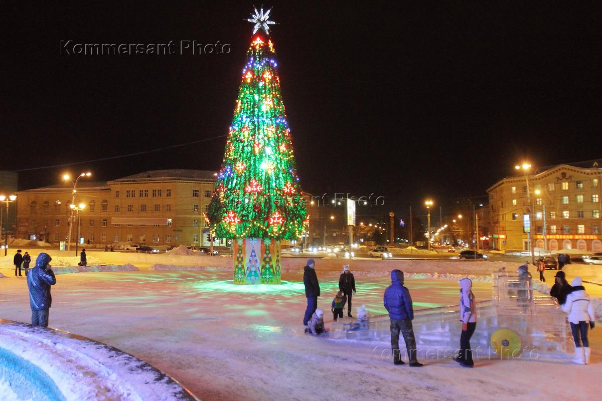 Views of Novosibirsk. People are by New Year's tree in Pimyonov Square in Novosibirsk.