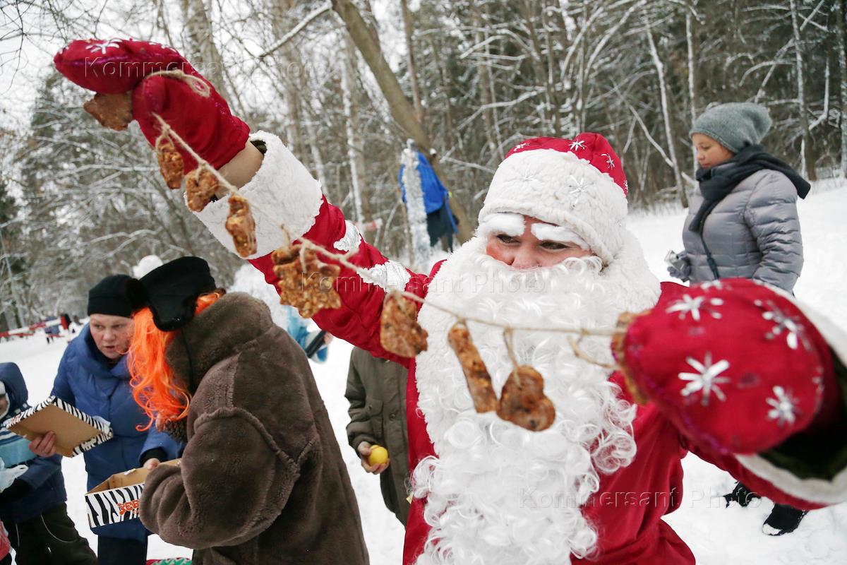 Пермское городское лесничество. Черняевский лес. Дед Мороз держит в руках корм для белок.