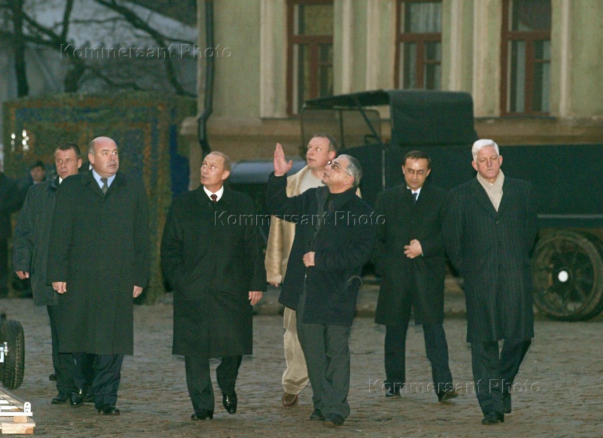 From left to right: Russian Culture Minister Mikhail Shvydkoi, Russian President Vladimir Putin, producer and actor Sergei Zhigunov, film director and "Mosfilm" director Karen Shakhnazarov, film director Andrei Zvyagintsev and First Deputy Culture Minister Alexander Golutva walk during the president's visit to "Mosfilm" cinema studio.