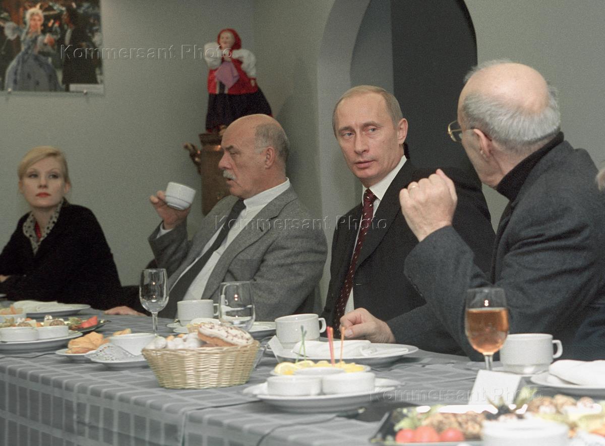 Президент России Владимир Путин (второй справа), актриса, драматург Рената Литвинова (слева), кинорежиссеры Станислав Говорухин (второй слева) и Георгий Данелия (справа) во время посещения Президента России киноконцерна "Мосфильм".