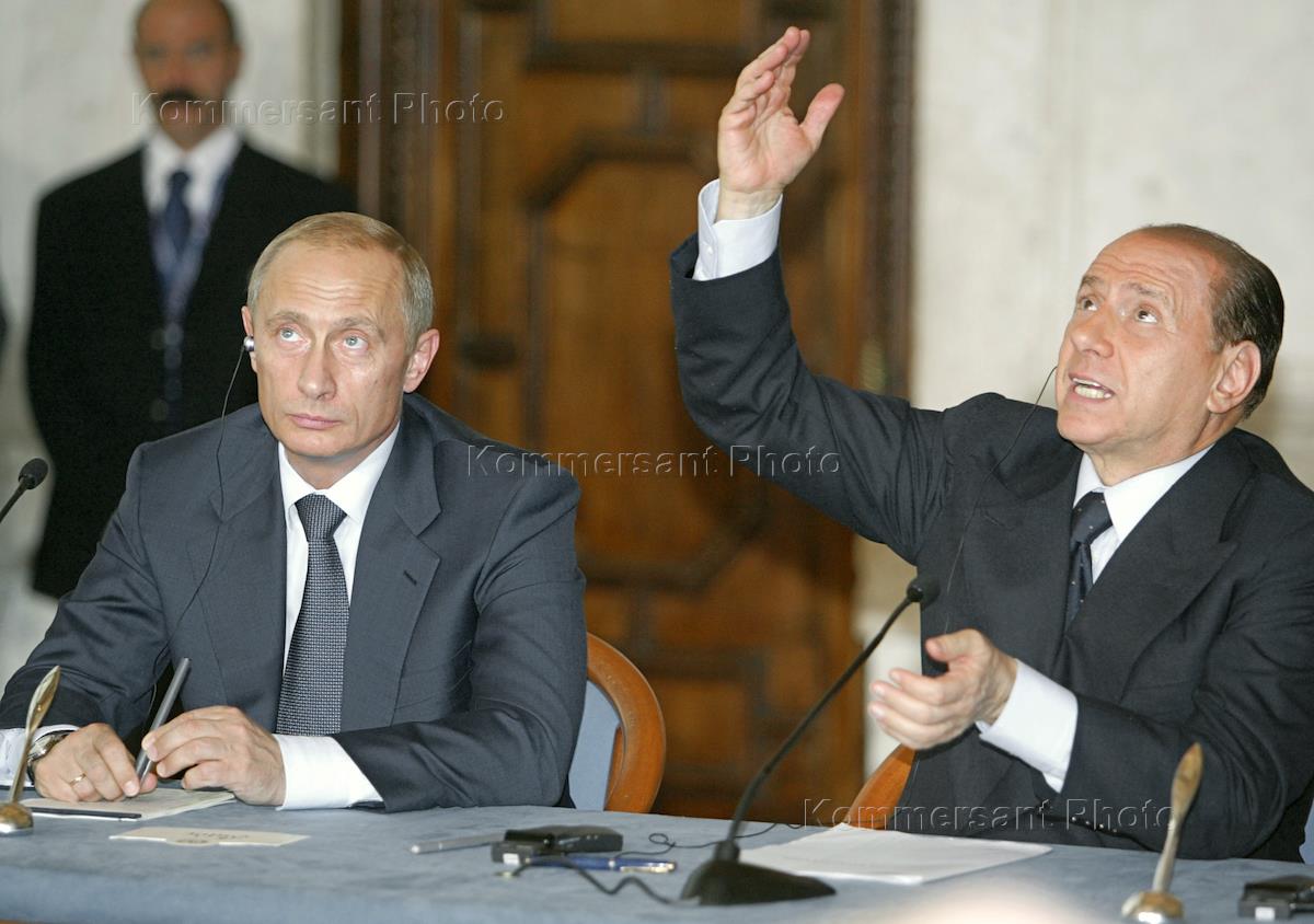 Russian President Vladimir Putin (left) confers with the Italian Prime Minister Silvio Berlusconi (right) during the news conference summoned after the Russian-Italian bilateral talks in Rome.
