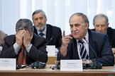 Начальник управления архитектурно-строительной инспекции мэрии г. Новосибирска Анатолий Мотыга (справа) и заместитель начальника главного управления благоустройства и озеленения города Новосибирска Борис Губер (слева) во время заседания архитектурно-градостроительного Совета в большом зале мэрии.