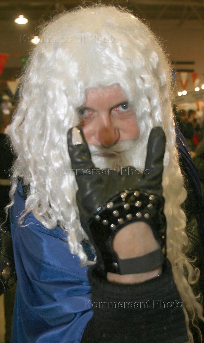 A heavy metal fan, dressed as Grandfather Frost (Russian counterpart of Santa Claus), poses for a photo during the 3rd international Grandfather Frost Forum, held on the premises of the All-Russian Expo Centre (VVC).
