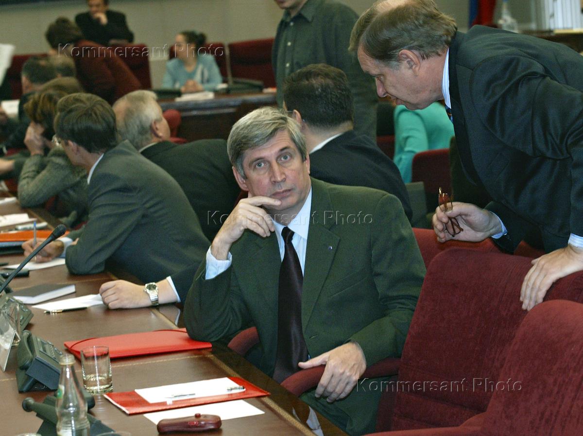 Chairman of the Russian Central Electoral Commission (CIK) Alexander Veshnyakov (left) attends the meeting summoned for the parliamentary candidates to draw the lots for distribution of free of charge TV and radio broadcasts of their pre-electoral shows.