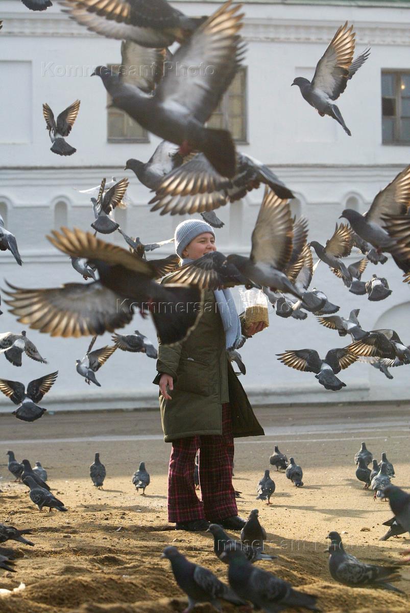 A girl feeds doves in the Svayto-Danilovsky Monastery backyard.