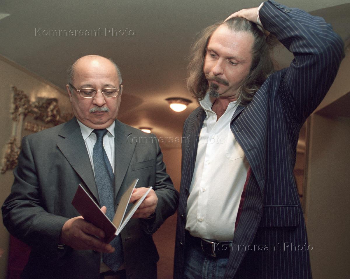 Director general of the Bolshoy Theatre Anatoly Iksanov (left) and film director Yury Grymov (right) get ready for the news conference headlined 'New Image - New Style of the Bolshoy Theatre'. The news conference was held in the Bolshoy Theatre Beethoven Hall.