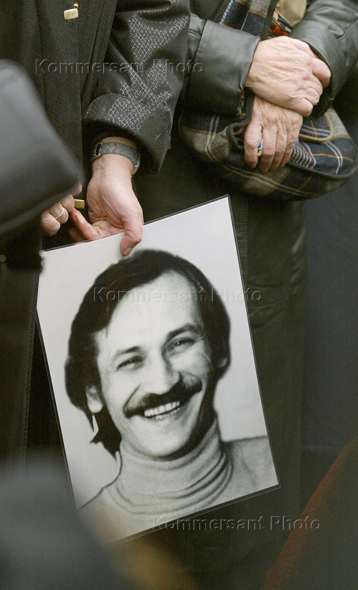 Russian film director Sergey Solovyev (centre) arrives at the civic eulogy meeting held in memory of the late actor and writer Leonid Filatov (portrayed in the photo in Mr. Solovyov's hand). The event took place in the Dom Kino ('Cinematography House').