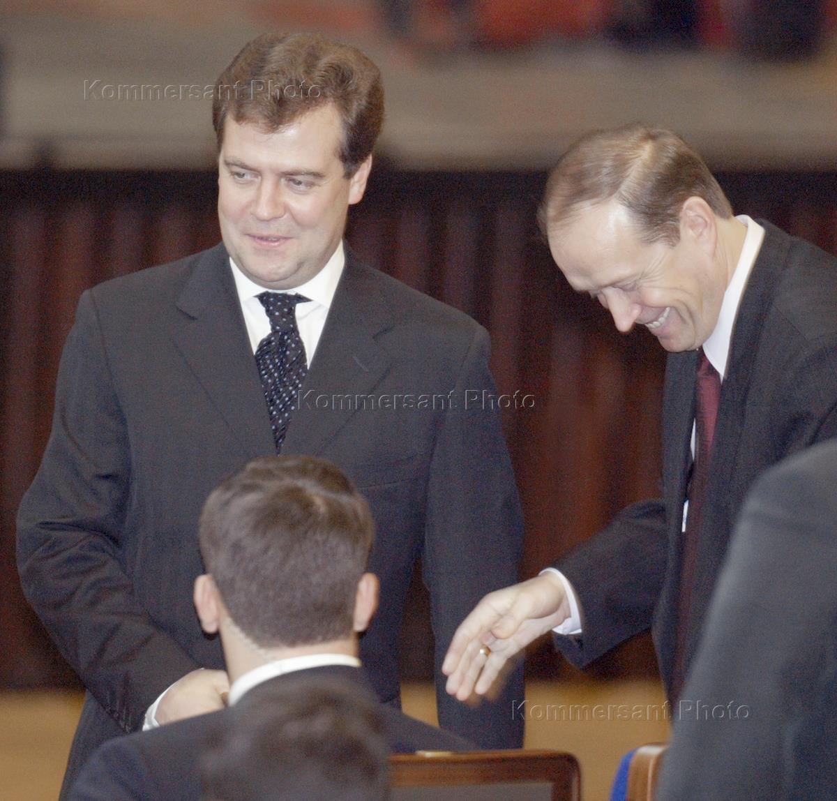 Руководитель администрации Президента России Дмитрий Медведев (слева) и председатель Центральной избирательной комиссии (Центризбирком) России Александр Вешняков (справа) на праздничном концерте, посвященном Дню милиции. Концерт состоялся в Государственном Кремлевском Дворце.