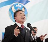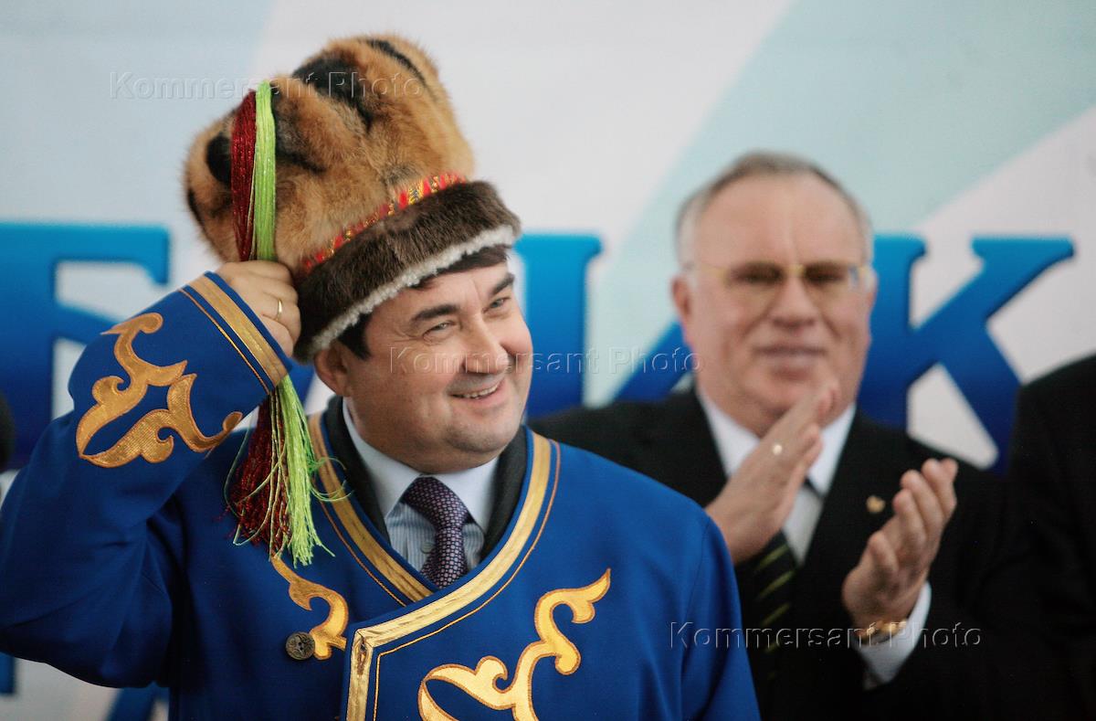 Председатель государственного собрания Эл Курултай Республики Алтай Иван Белеков (слева) и генеральный директор ОАО "Особые экономические зоны" Олег Костин (справа) во время открытия реконструированного аэропорта и ВПП в Горно-Алтайске.