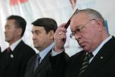 Церемония открытия аэропорта "Горно-Алтайск" после реконструкции. Слева направо: председатель Госсобрания Эл Курултай Республики Алтай Иван Белеков, министр транспорта России Игорь Левитин и глава республики Алтай Александр Бердников во время церемонии.